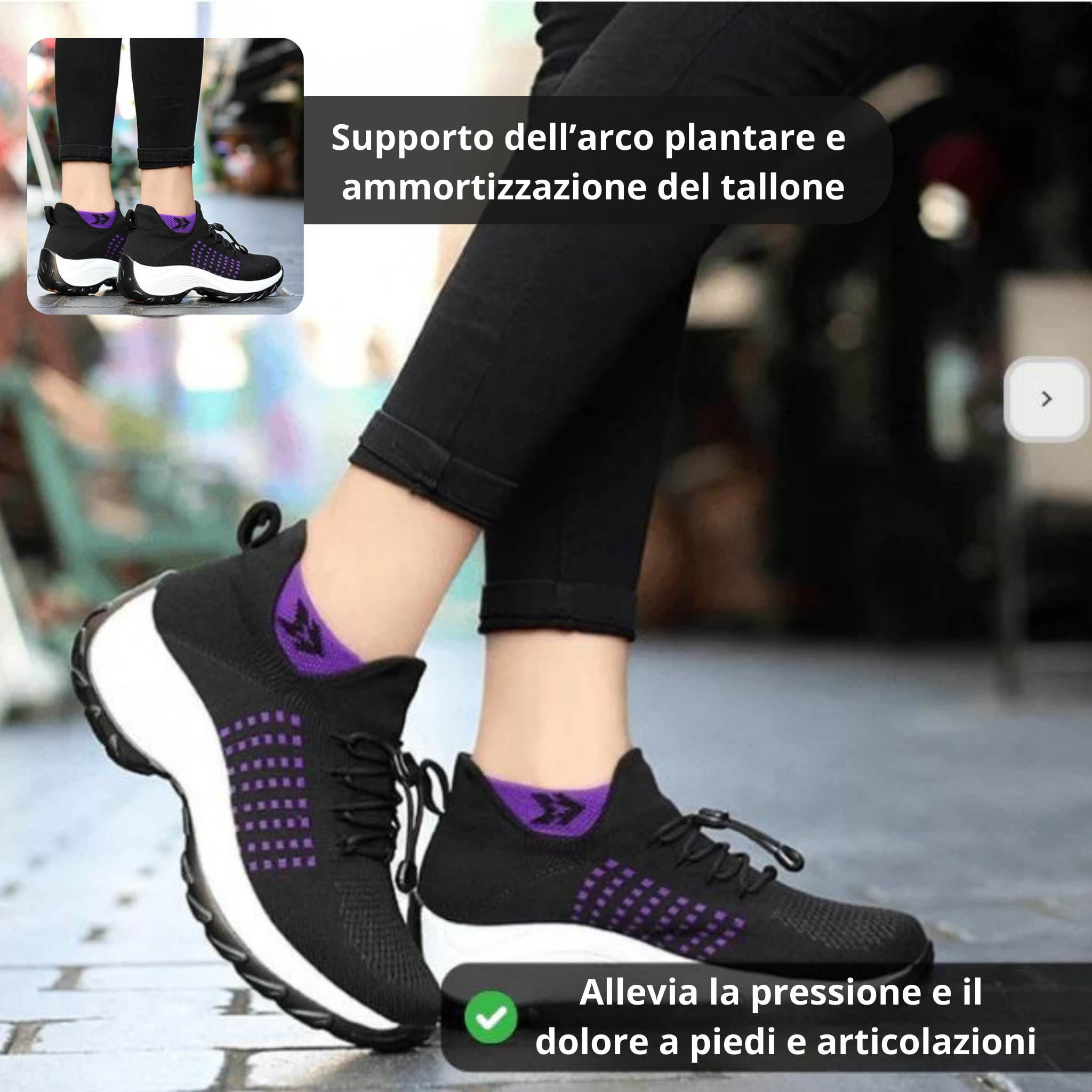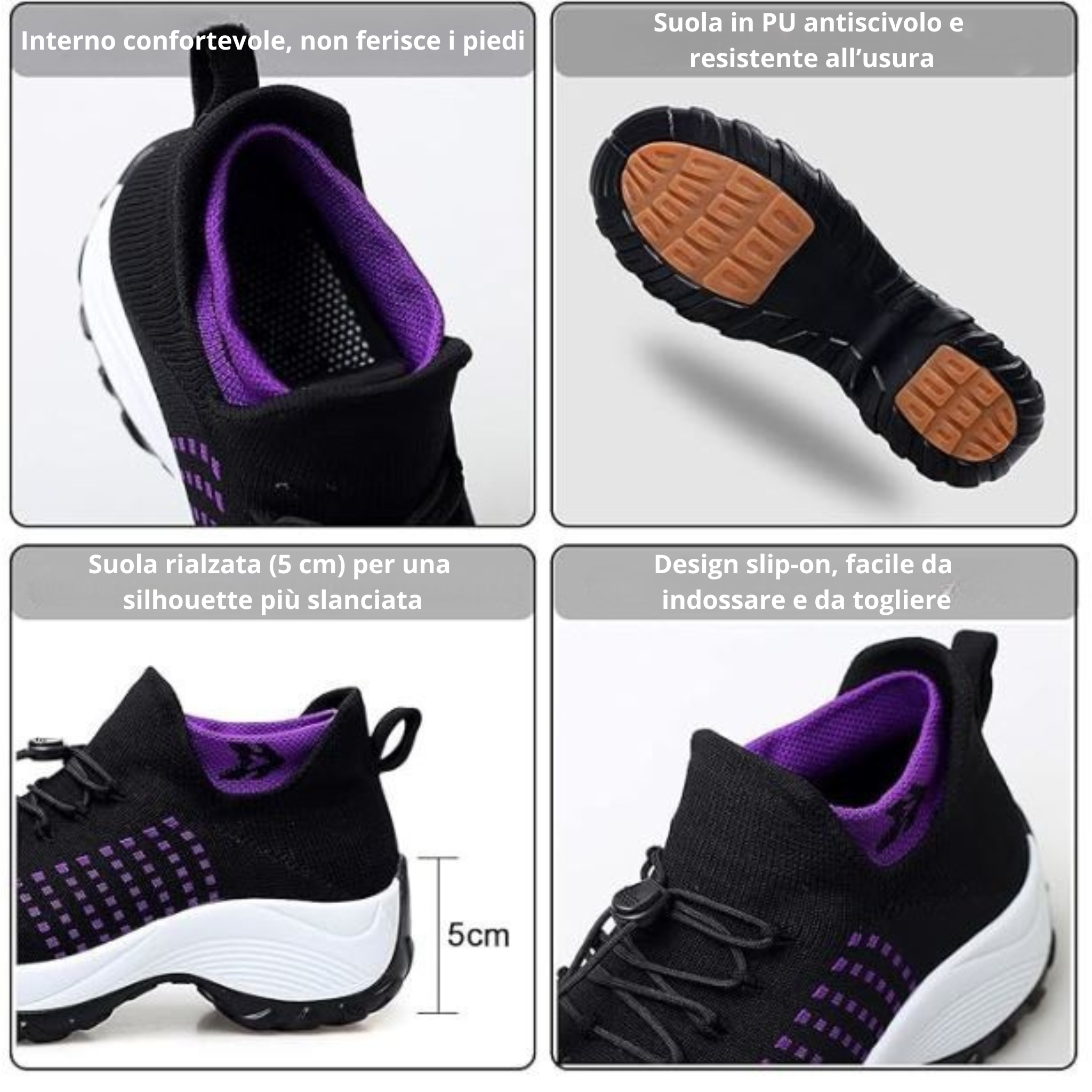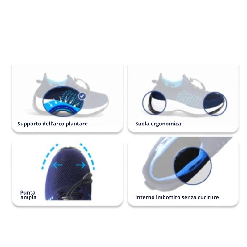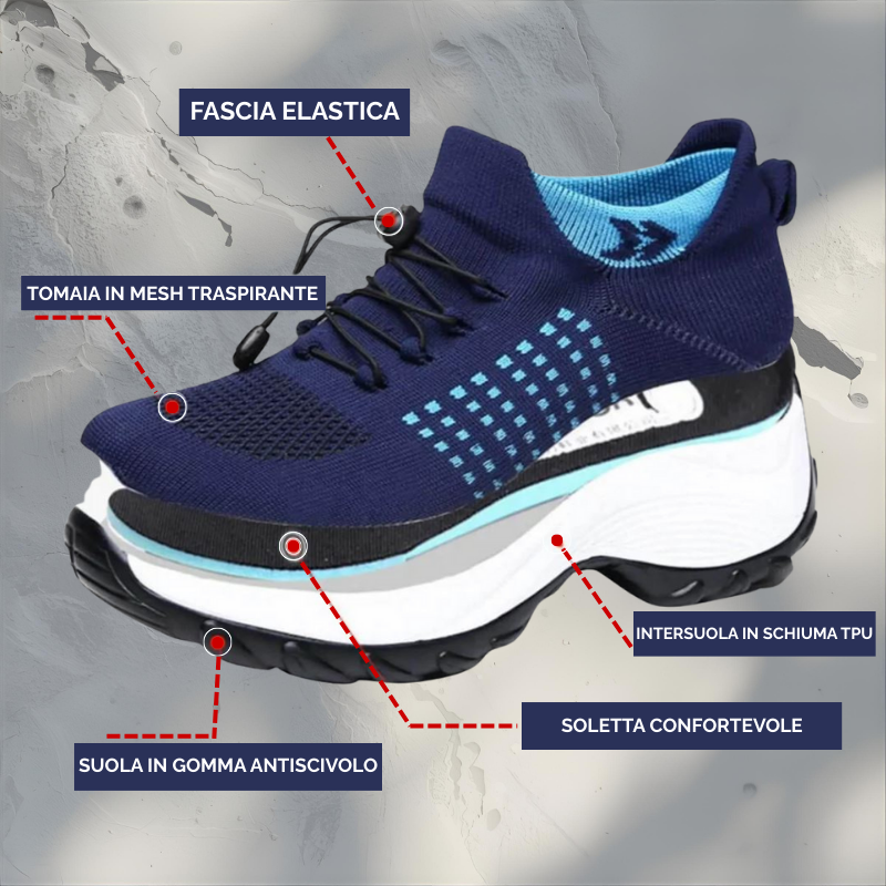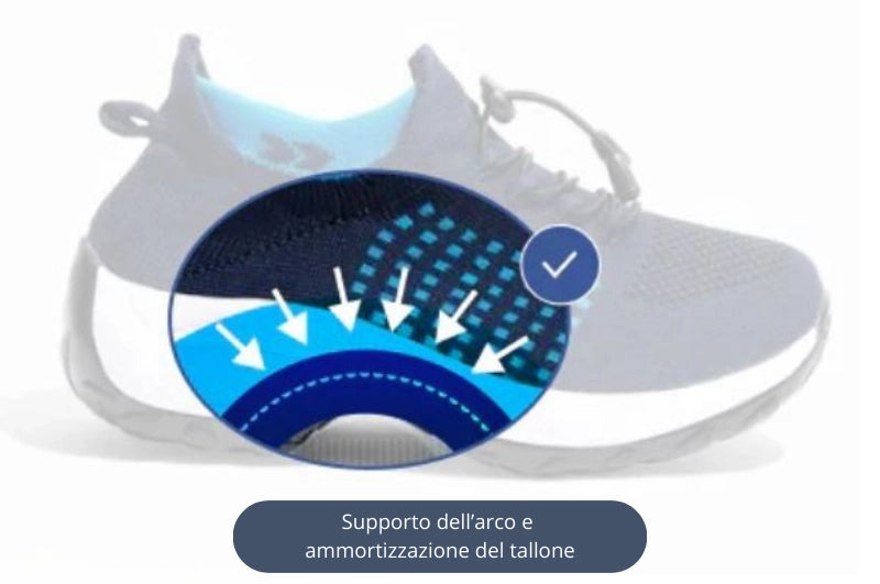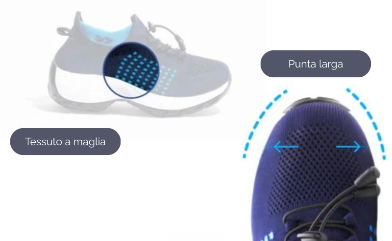 ✔ Tomaia morbida e flessibile: materiali elastici che minimizzano sfregamenti e stress, favorendo la circolazione.