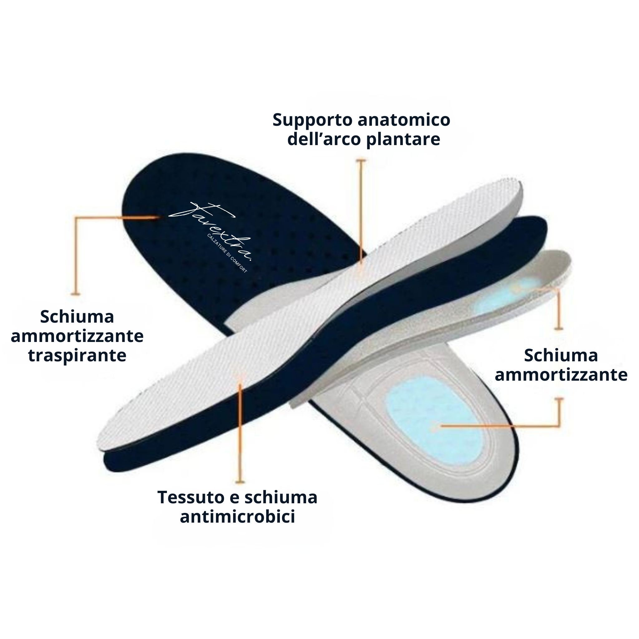 ✔ Supporto plantare rinforzato: solette progettate per stabilizzare l’arco e ridurre la pressione, favorendo un corretto allineamento del piede.